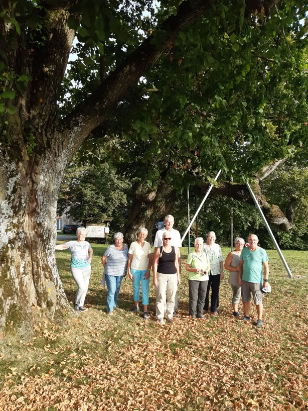 Unsere Wanderung starteten wir in Kasberg (oberhalb von Gräfenberg). Als erstes bestaunten wir die historische Linde, die nach unterschiedlichen Schätzungen zwischen 600 – 1000 Jahr alt ist. Danach ging es weiter - vorbei an Obstbäumen mit Zwetschgen und Äpfeln und Ausblicken auf die fränkischen Erhebungen. Nach ca. 1 ½ Stunden erreichten wir unser Mittagsziel „Haidhof“, wo wir uns mit Speis und Trank stärkten. Ein Teil der Gruppe bestieg danach noch den Schloßbergfelsen mit herrlicher Aussicht. Nach Kaffee, Kuchen oder Eis traten wir den Rückweg nach Kasberg an. Somit ging ein sonniger Spätsommertag zu Ende.