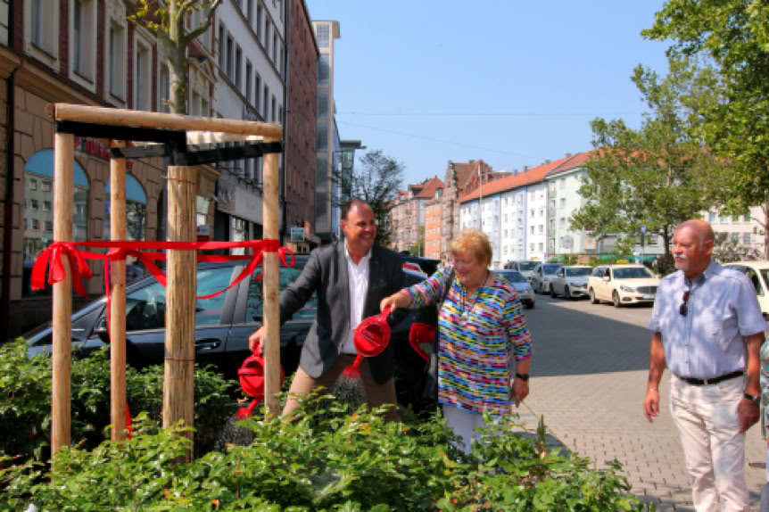 Bürgermeister Christian Vogel und unser Vorstandsmitglied Karla Rammrath gießen die vom Vorstadtverein Wöhrd gespendete „Hainbuche“ am Stresemannplatz. Ein Beitrag dazu, unsere Stadtteile grüner und lebenswerter zu machen.